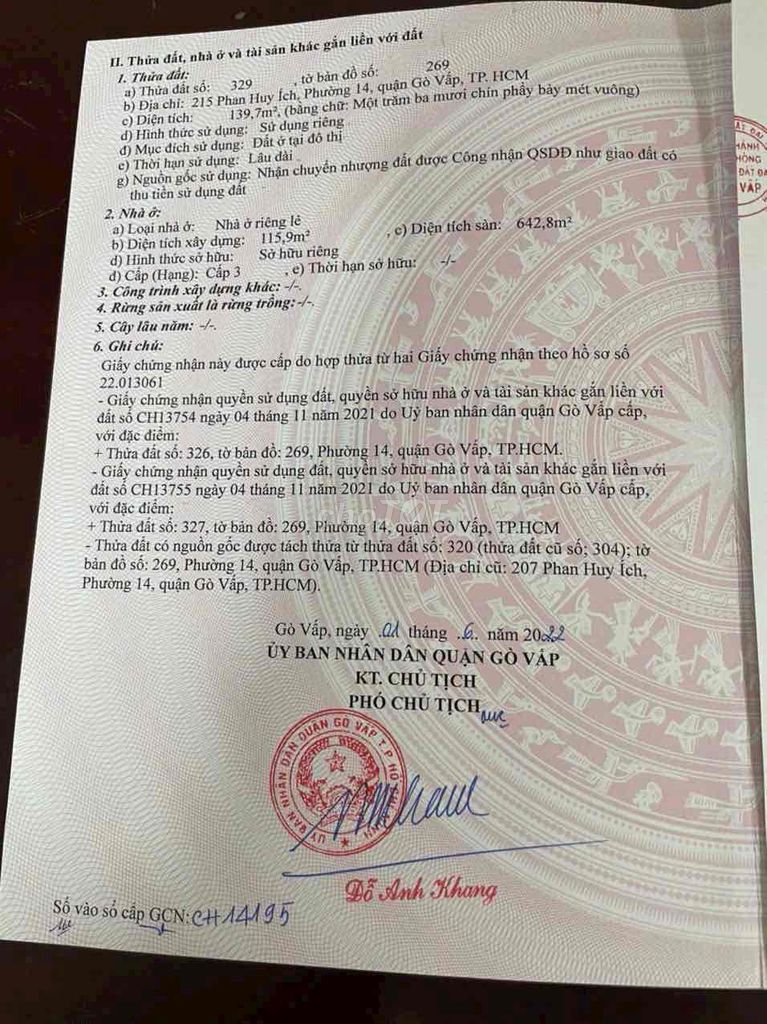 | 215 Phan Huy Ích, Gò Vấp | 139.7 | 642.8 | 36.5 | 261.27 | Nhà góc 2 mặt tiền, 6 tầng, thang máy, nội thất cao cấp |