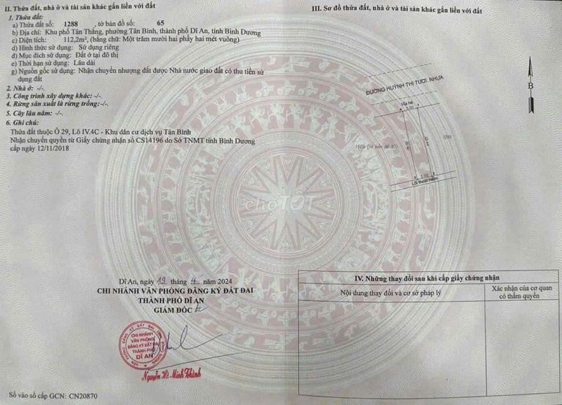 | Phường Tân Bình, TP. Dĩ An | Nhà mặt phố, 1 tầng | 112 | 37,50 | 4,2 | Vị trí gần KDC Biconsi, đường rộng 12m, 6 phòng ngủ, 5 vệ sinh |