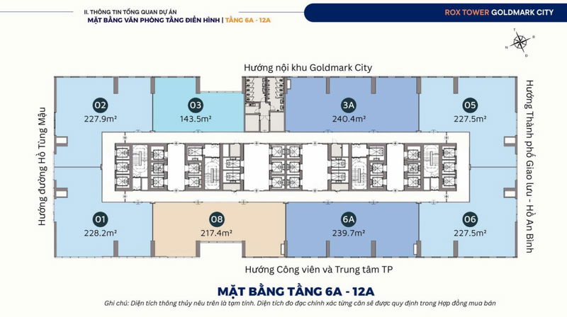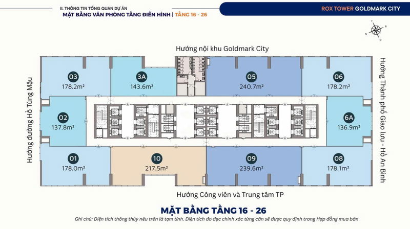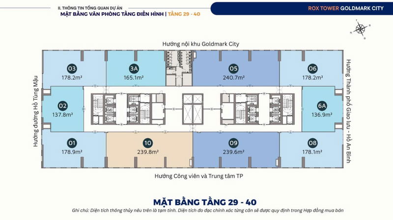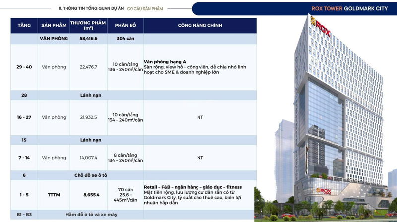 | Hạ tầng & Tiện ích | 40 tầng, 26 thang máy tốc độ cao, điều hòa trung tâm, 3 tầng hầm để xe | Tiêu chuẩn văn phòng quốc tế, cạnh tranh với các dự án cùng phân khúc |