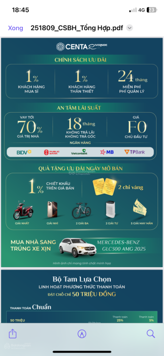 - Đề xuất đóng tiền nhanh để nhận ưu đãi vay 70% miễn lãi gốc 18 tháng, giúp giảm áp lực tài chính cho chủ đầu tư.