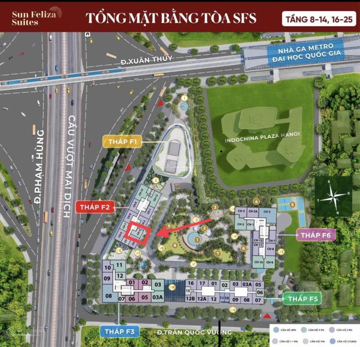 Sun Feliza Suites 54 2 8,0 (ước chừng) ~148 Cầu Giấy, mặt tiền Phạm Hùng & Xuân Thủy Trung tâm thương mại, bể bơi, gym, spa, trường học, an ninh 24/7 Sổ đỏ/Sổ hồng 2024