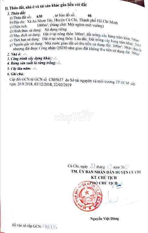 Diện tích đất tổng là 1000 m², trong đó 300 m² thổ cư, phần còn lại là đất trồng cây lâu năm hoặc đất nông nghiệp. Giá bán 8,5 tỷ đồng tương đương 8,500,000 đồng/m² đất toàn khuôn viên. Nếu tính riêng phần đất thổ cư thì giá thực tế lên đến khoảng 28,3 triệu đồng/m² thổ cư, khá cao so với mặt bằng đất thổ cư tại huyện Củ Chi hiện nay.
