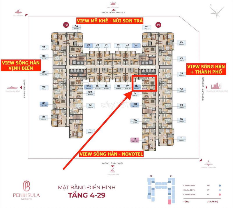 | Peninsula P2 (căn 3016) | Quận Sơn Trà, view sông Hàn | 45,3 | 1PN, cơ bản | 30 | 61,81 | 2,8 | Chưa bàn giao (dự kiến Q2/2026) | 2024 |