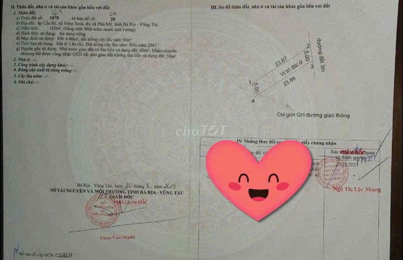 | Hẻm 300m từ Võ Văn Kiệt, xã Sông Xoài | 115 (60m² thổ cư) | Thổ cư một phần | 6,09 | 700 | Giá chào bán hiện tại |