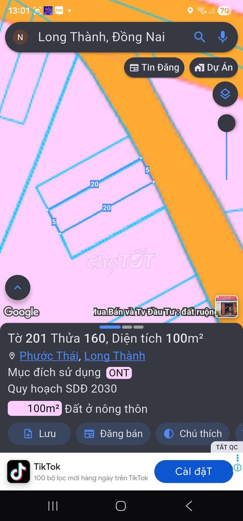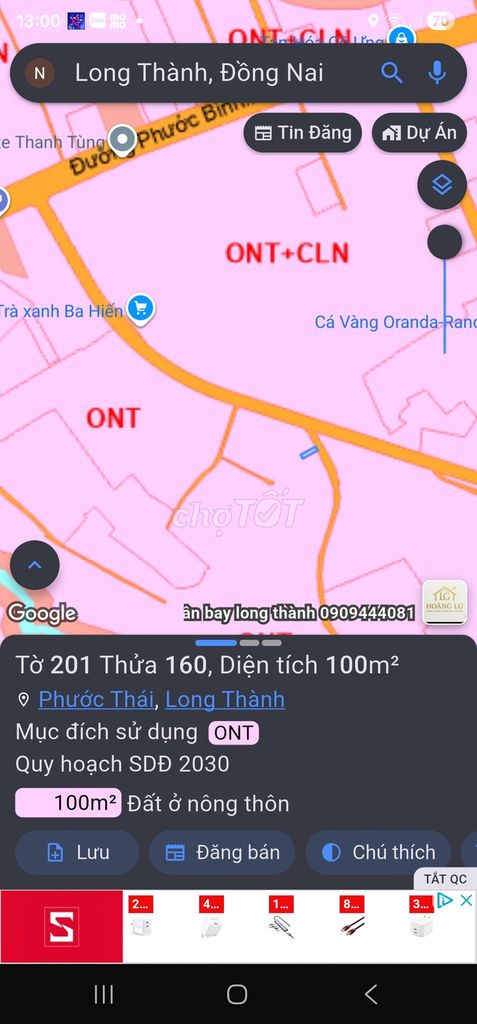 Lô đất có diện tích 100m², mặt tiền 5m, chiều dài 20m, thổ cư toàn bộ, đường nhựa, vị trí thuộc xã Phước Bình, huyện Long Thành, Đồng Nai, có giấy tờ pháp lý đầy đủ, sổ đỏ chính chủ. Giá chủ đất đưa ra là 1,3 tỷ đồng, tương đương 13 triệu đồng/m².