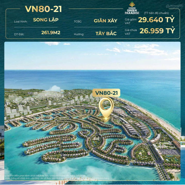 | Biệt thự song lập biển | Vinhomes Green Paradise – Cần Giờ | 261,9 | 29,64 | 113,17 (tính trên diện tích đất) | Giá chủ đầu tư công bố |