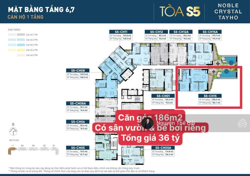 Căn hộ tại dự án Noble Crystal Tây Hồ có diện tích thông thủy 186m², trong đó sân vườn và bể bơi riêng chiếm đến 72m², tạo nên một không gian sống sang trọng và độc đáo. Với mức giá 36 tỷ đồng, đơn giá trung bình khoảng 193 triệu/m² (tính trên tổng diện tích sử dụng).