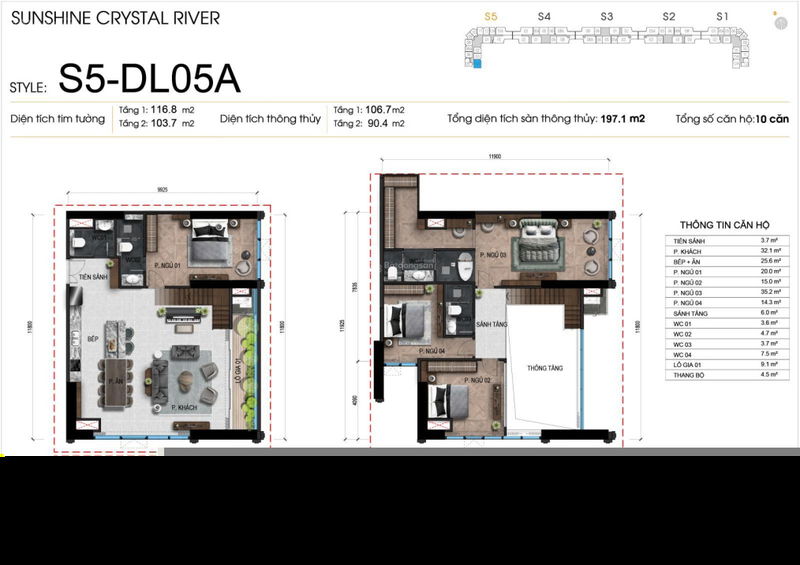 - Căn góc Duplex với diện tích lớn 197m², thiết kế 4PN – 4VS phù hợp gia đình đa thế hệ hoặc có nhu cầu không gian rộng rãi.