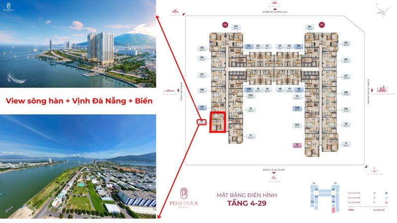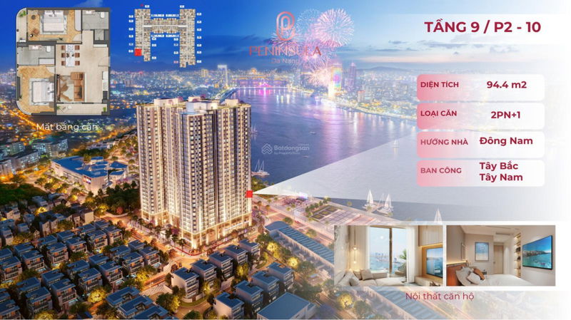 | Peninsula Đà Nẵng (căn góc 2PN+1, view sông Hàn) | 94,4 | 2 | 6,8 | ~72 | View sông Hàn, nội thất liền tường, tòa P2, pháp lý sổ hồng lâu dài |