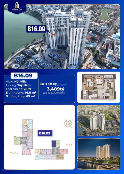 Căn hộ B16-09 thuộc dự án Lakeside Garden, diện tích 76,8m², 2 phòng ngủ 2 vệ sinh theo mô tả, tuy nhiên dữ liệu thực tế cung cấp 3PN 3WC nên cần kiểm tra lại thực tế căn hộ để tránh nhầm lẫn. Giá chào bán 3,49 tỷ đồng tương đương đơn giá khoảng 45,45 triệu/m² (3,490 tỷ / 76,8m²). Đây là mức giá khá cao so với mặt bằng chung các dự án căn hộ tại trung tâm Hải Phòng, nhưng vẫn có thể hợp lý nếu xét đến vị trí view hồ trực diện 24ha, tầng cao (tầng 16), và tiện ích đồng bộ.