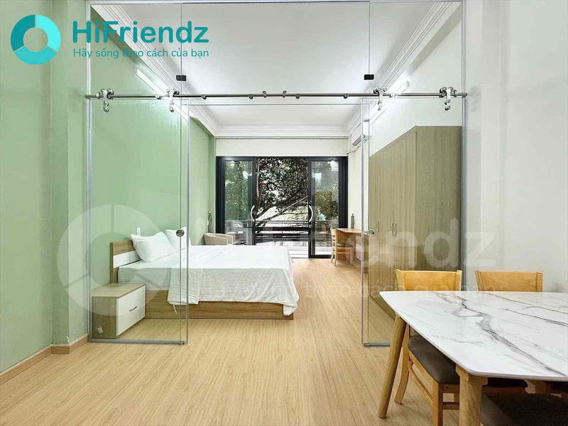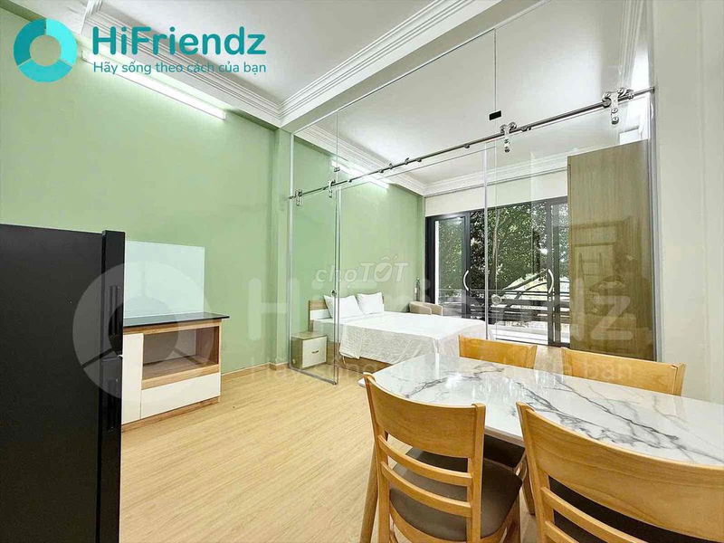 Căn phòng studio thiết kế hiện đại nội thất đồng bộ và ánh sáng tự nhiên cực kỳ thoáng mát. Phòng phù hợp cho người đi làm, cặp đôi hoặc khách cần một không gian sống sạch sẽ – riêng tư – tiện nghi.