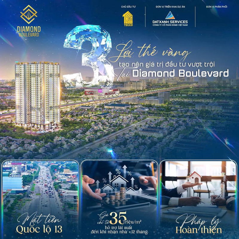 Diamond Boulevard 39,53 43 Mặt tiền QL13, gần Metro số 2, Vành Đai 2 & 3, đầy đủ tiện ích nội khu Chưa bàn giao, thanh toán linh hoạt, hỗ trợ vay 70% 0% lãi suất