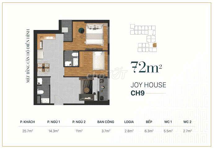 | Diện tích | 72 m² | 60 – 80 m² | Phù hợp với diện tích phổ biến trên thị trường |