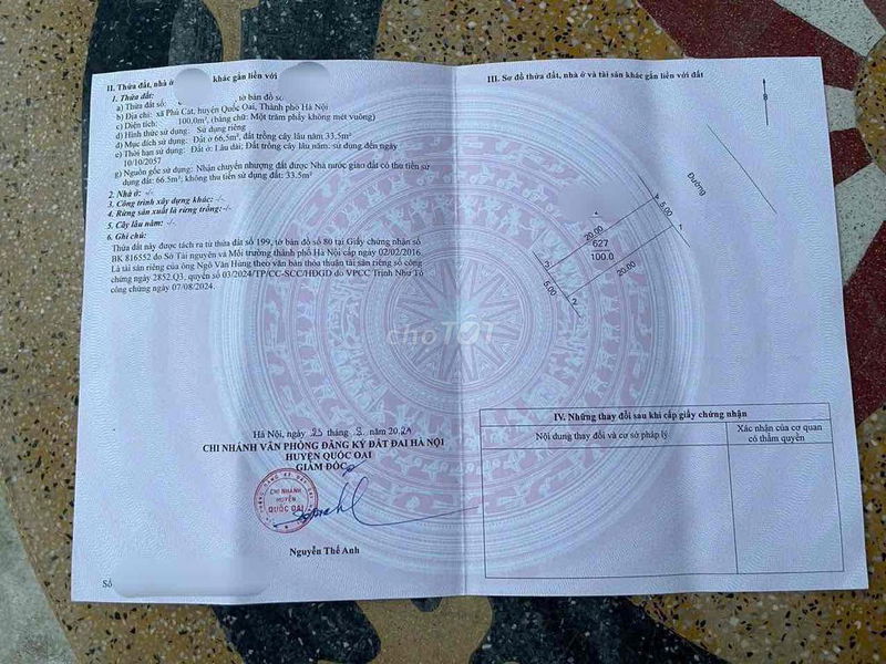 | Tái Định Cư Vai Réo, Quốc Oai | 100 m² | Đất thổ cư | 45 | 4,5 | 2024 | Đường rộng 8m, gần khu CN cao, đất mặt tiền |