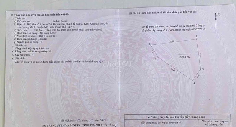 | Thị trấn Quang Minh, Mê Linh | Đất nền dự án biệt thự | 53,45 | 290 | 15,5 | 2024 |