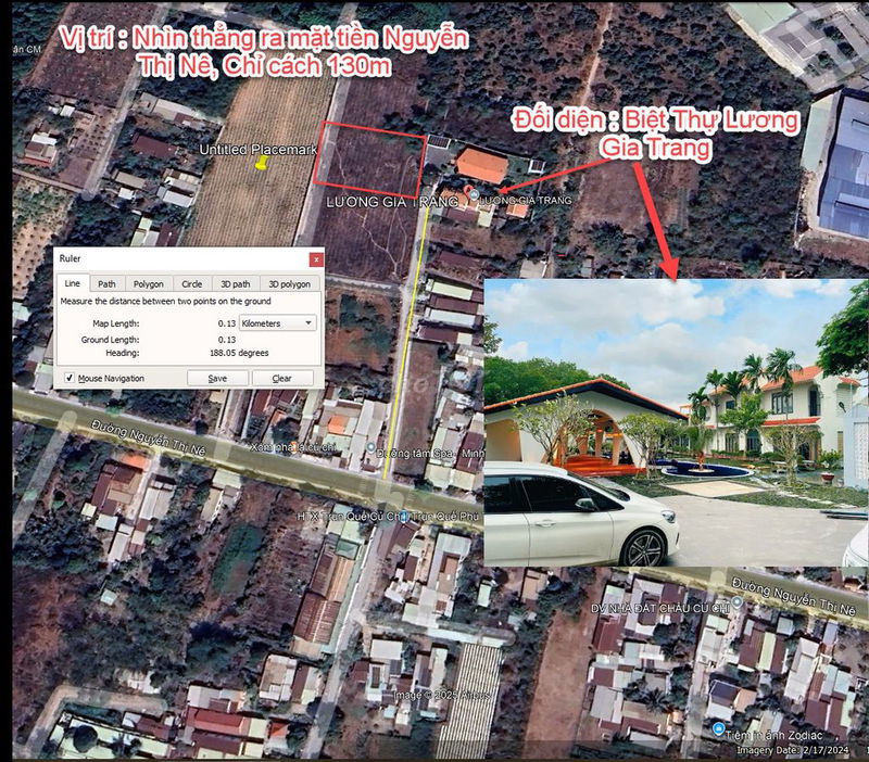 Cách mặt tiền Nguyễn Thị Nê chỉ có 130m , đối diện biệt thư Lương Gia Trang, Di chuyển về trung tâm sân bay chỉ có 30km mất khoảng 45phut.