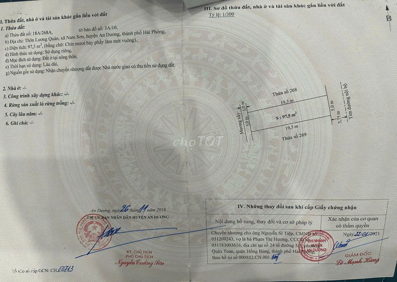 | An Dương (Lương Quán) | Đất thổ cư | 97 | 26,60 | 2,58 | Gần trường, chợ, đường 7m, sổ đỏ chính chủ |