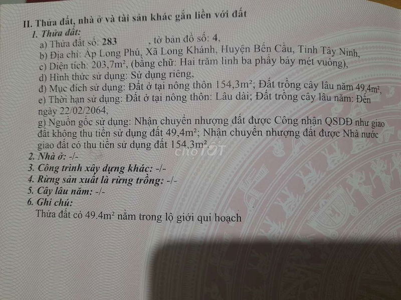 | Xã Long Khánh, Bến Cầu, Tây Ninh | Đất thổ cư, mặt tiền đường nhựa 9m | 204 | 2,89 | 590 | 2024 |