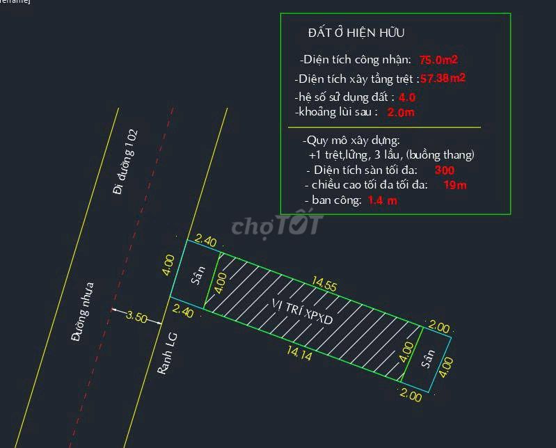 - Diện tích và kích thước: Diện tích 75m² khá nhỏ, chiều ngang 4m hơi hẹp, có thể hạn chế thiết kế xây dựng, giảm giá trị so với lô có chiều ngang rộng hơn.