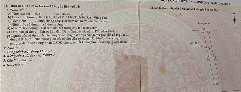 Mảnh đất có diện tích 226 m² (chiều dài 45m, chiều ngang 5m) thuộc loại đất thổ cư, mặt tiền, hướng Tây Bắc, nằm tại Khu phố 4, Phường Hắc Dịch, Thị xã Phú Mỹ, tỉnh Bà Rịa – Vũng Tàu. Mảnh đất đã có sổ hồng riêng, pháp lý rõ ràng, vị trí gần cao tốc Biên Hòa – Vũng Tàu, gần khu du lịch suối Nhum và chỉ cách đường Võ Văn Kiệt 500m, đây là những yếu tố thuận lợi cho giao thông và phát triển kinh doanh hoặc xây dựng nhà ở.