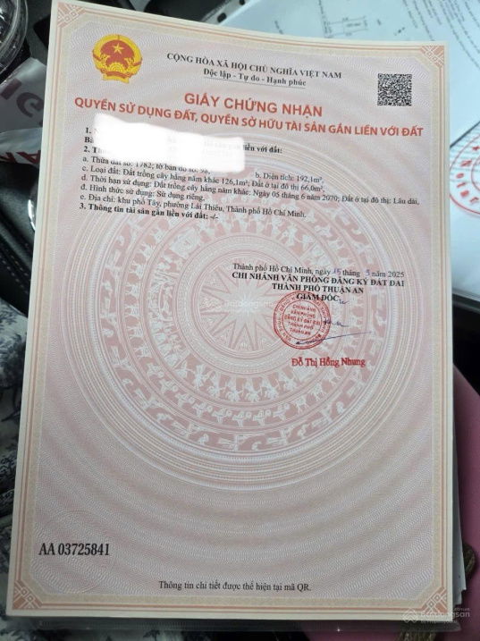 Diện tích 192m², có 66m² ODT có thể lên thêm thổ cư 80% trên tổng diện tích đất.