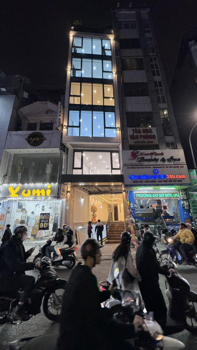 Tòa nhà mới xây 9 tầng, thang máy mới. Diện tích 100m², thông sàn. Có hầm để xe. Trước nhà 3 ô tô tránh nhau.