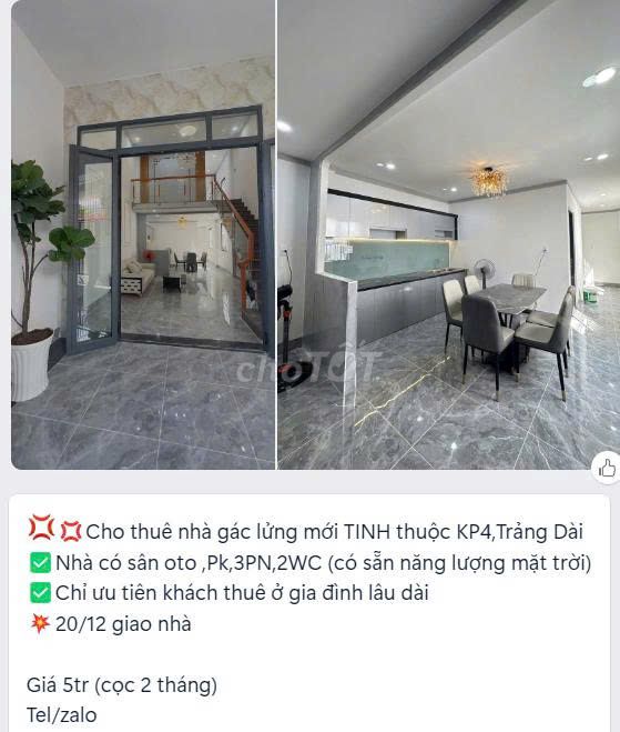 Check giá "CHO THUÊ NHÀ PHƯỜNG TRẢNG DÀI GIÁ 5 TRIỆU"