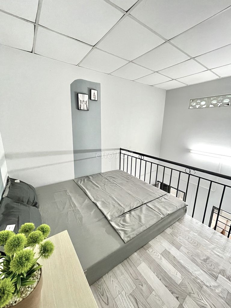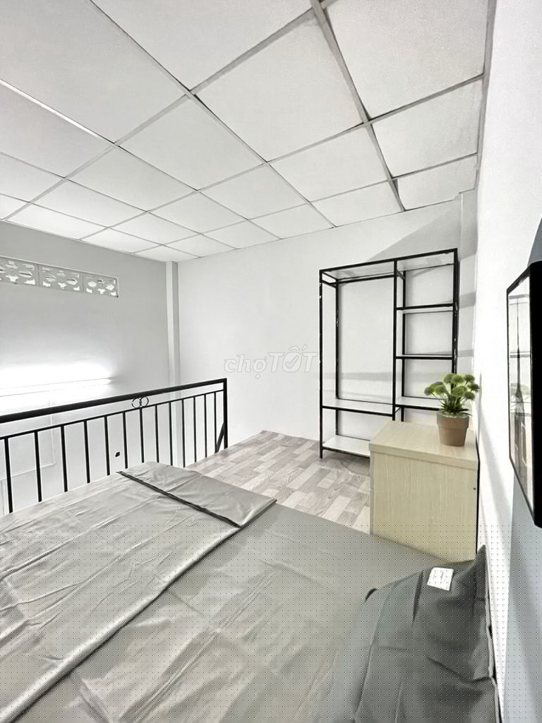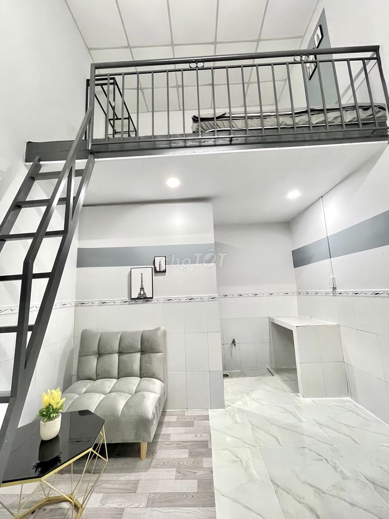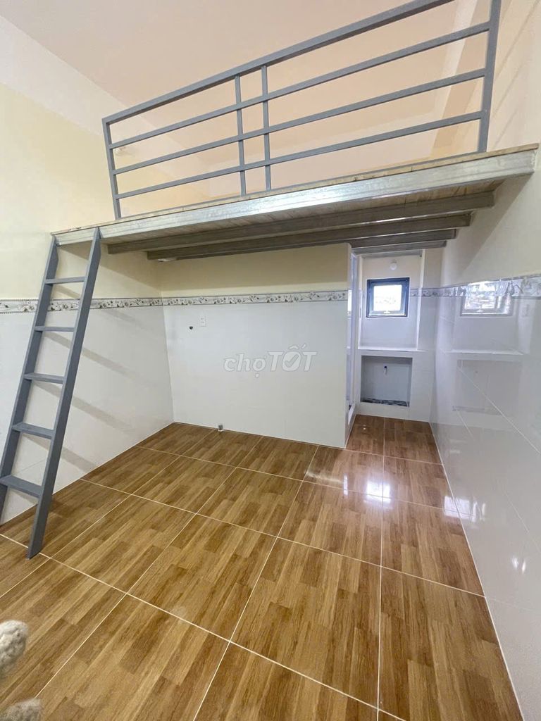 - Phòng có gác lửng và kệ bếp, giúp tận dụng không gian, phù hợp cho người ở lâu dài hoặc sinh viên có nhu cầu nấu ăn.