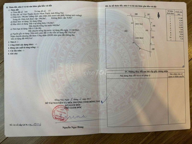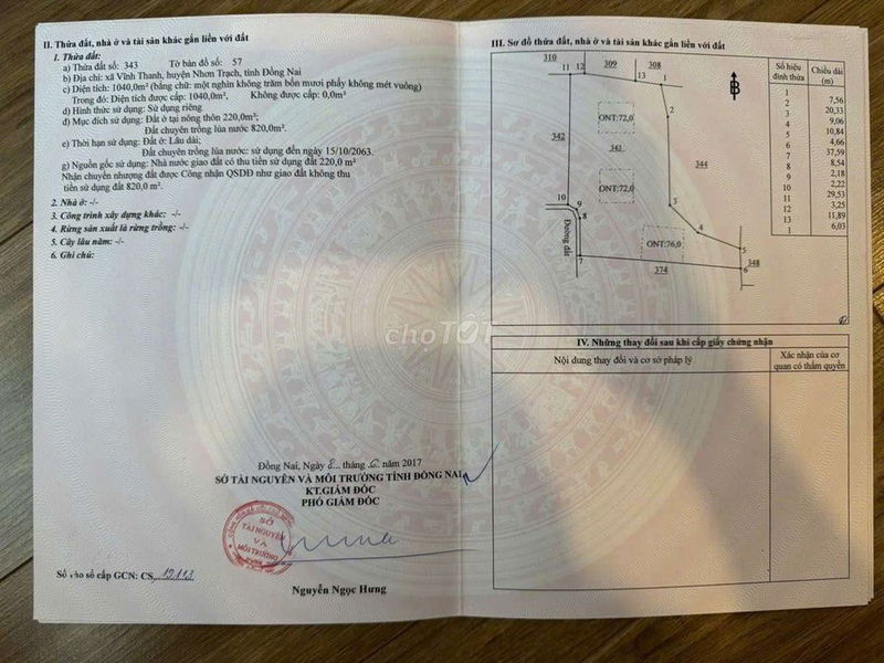 Tổng diện tích đất là 4.695 m², trong đó có 1.028 m² thổ cư, thuộc xã Vĩnh Thanh, huyện Nhơn Trạch, Đồng Nai. Giá chào bán là 28,17 tỷ đồng, tương đương 6 triệu đồng/m².