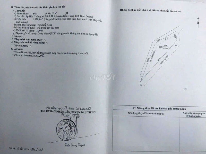 Với diện tích 52.000 m² (tương đương 5,2 ha), loại đất nông nghiệp, mặt tiền rộng 350 m, chiều dài 150 m, đất tọa lạc tại xã Minh Hoà, huyện Dầu Tiếng, tỉnh Bình Dương. Giá chào bán là 26 tỷ đồng, tương đương khoảng 500.000 đồng/m².