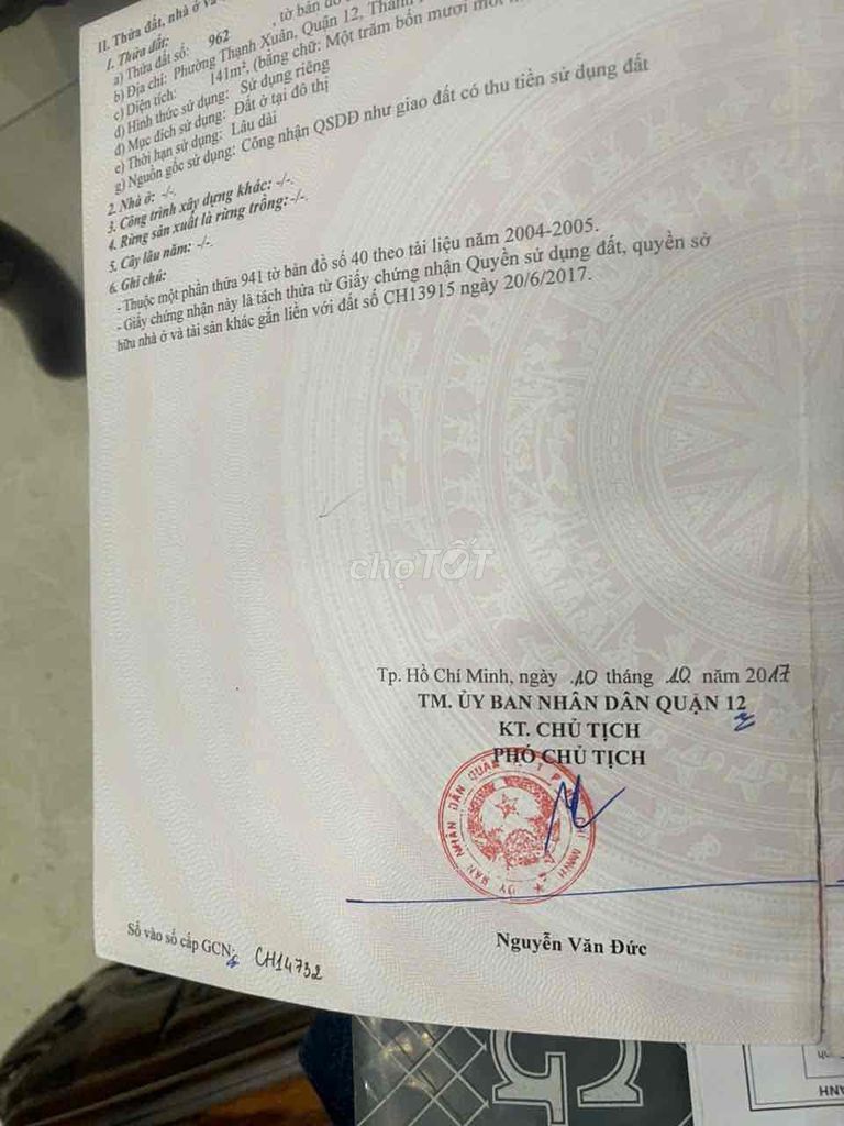 | Ngã tư Ga, Quận 12 | 120 | 6,0 | 50,00 | Hẻm xe máy, đất thổ cư, đã có sổ | 05/2024 |