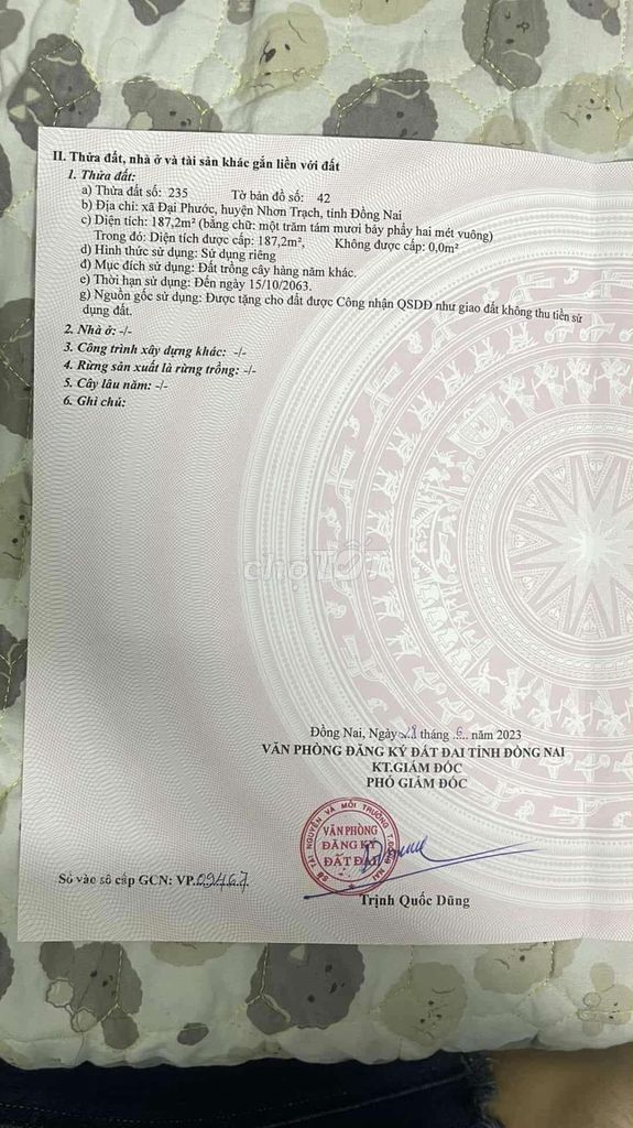 Đất nông nghiệp tại xã Đại Phước, huyện Nhơn Trạch được rao bán với diện tích 187 m², giá 2,2 tỷ đồng (tương đương 11,76 triệu đồng/m²). Dự án đã có sổ đỏ nhưng chưa có thổ cư, thuộc loại đất nông nghiệp.