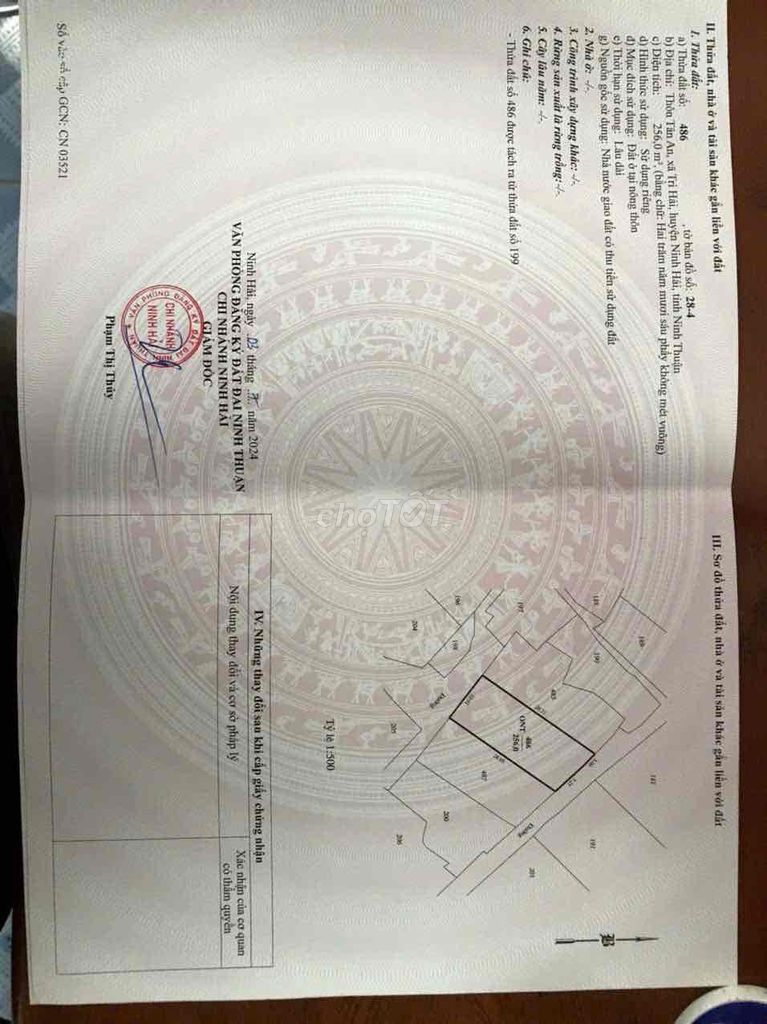 | Xã Tri Hải, Ninh Hải | Đất thổ cư | 256 m² | 7,42 | 1,9 | Gần biển, đường bê tông, sổ đỏ đầy đủ, mặt tiền |