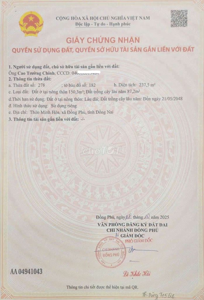 Đường Xuyên Tâm, Xã Đồng Tiến 250 800.000 200 triệu 2024 Giá chào bán hiện tại