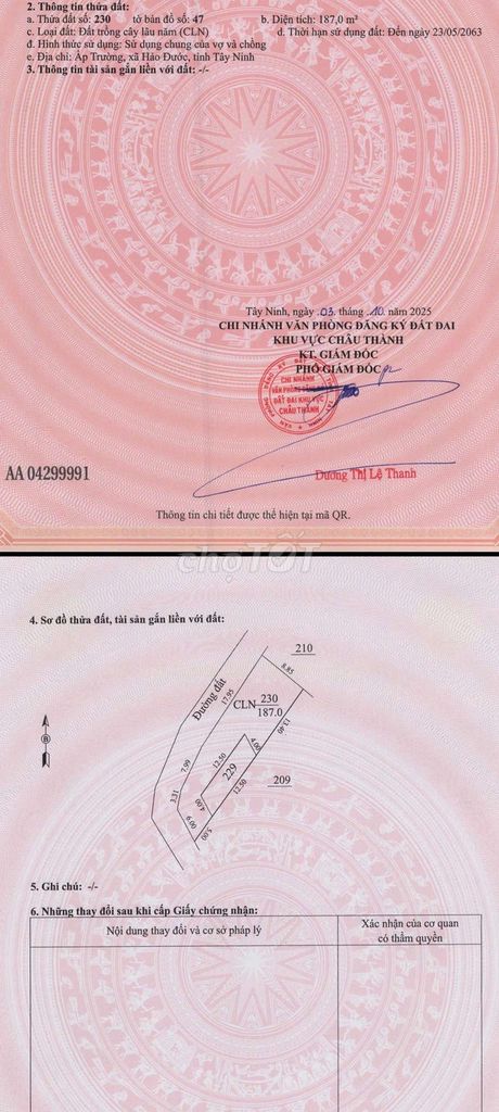 Với diện tích 237 m², giá chào bán 260 triệu đồng tương đương khoảng 1,10 triệu đồng/m². Vị trí đất tại xã Hảo Đước, huyện Châu Thành, Tây Ninh, đất thổ cư, đã có sổ đỏ hợp pháp và có 50 m² thổ cư, đất 2 mặt tiền, đường dự án Kênh vượt sông, cách đường nhựa 500m, cách trung tâm huyện và chợ Cao Xá 5km. Đây là vùng bán nông thôn, hạ tầng khu vực còn đang phát triển.