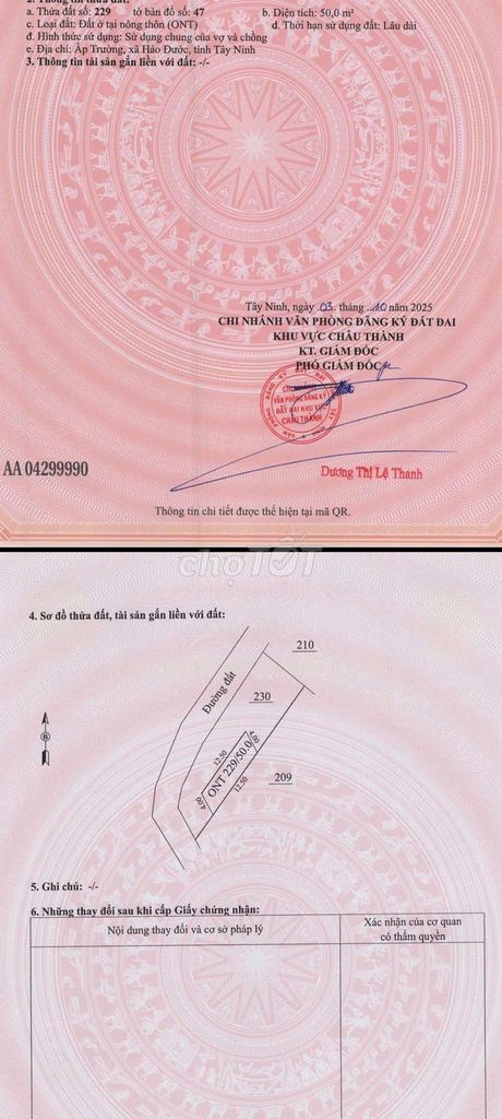 | Xã Hảo Đước, Châu Thành, Tây Ninh | 237 | 1,10 | 260 | Đất thổ cư, mặt tiền, cách đường nhựa 500m |