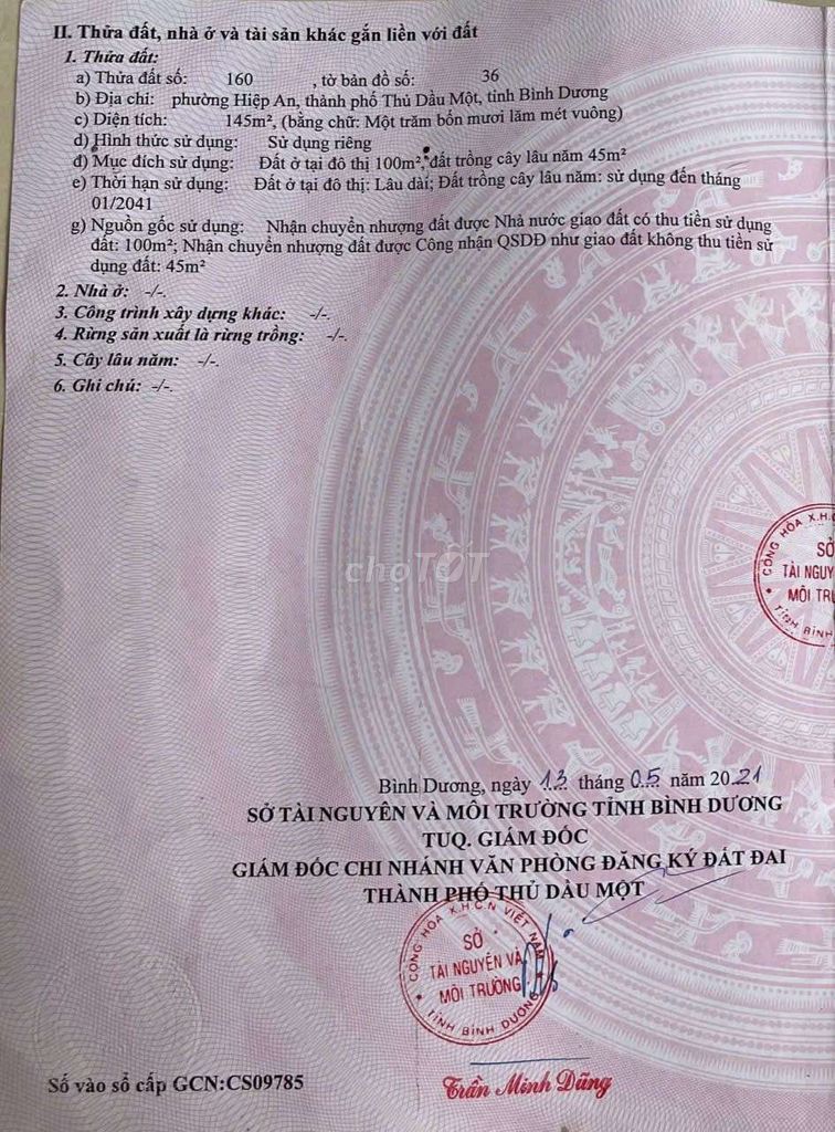 | Đường Lê Chí Dân, Hiệp An, Thủ Dầu Một | 145 | 1,9 | 13,10 | Thổ cư 100 m², hẻm xe hơi, gần KDL Đại Nam | 2024 – hiện tại |