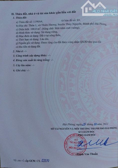 Mức giá đưa ra là 2,4 tỷ đồng tương đương 24 triệu đồng/m² trên diện tích 100m² đất thổ cư, đất ở có sổ hồng tại khu vực Thiên Hương, Thủy Nguyên, Hải Phòng.