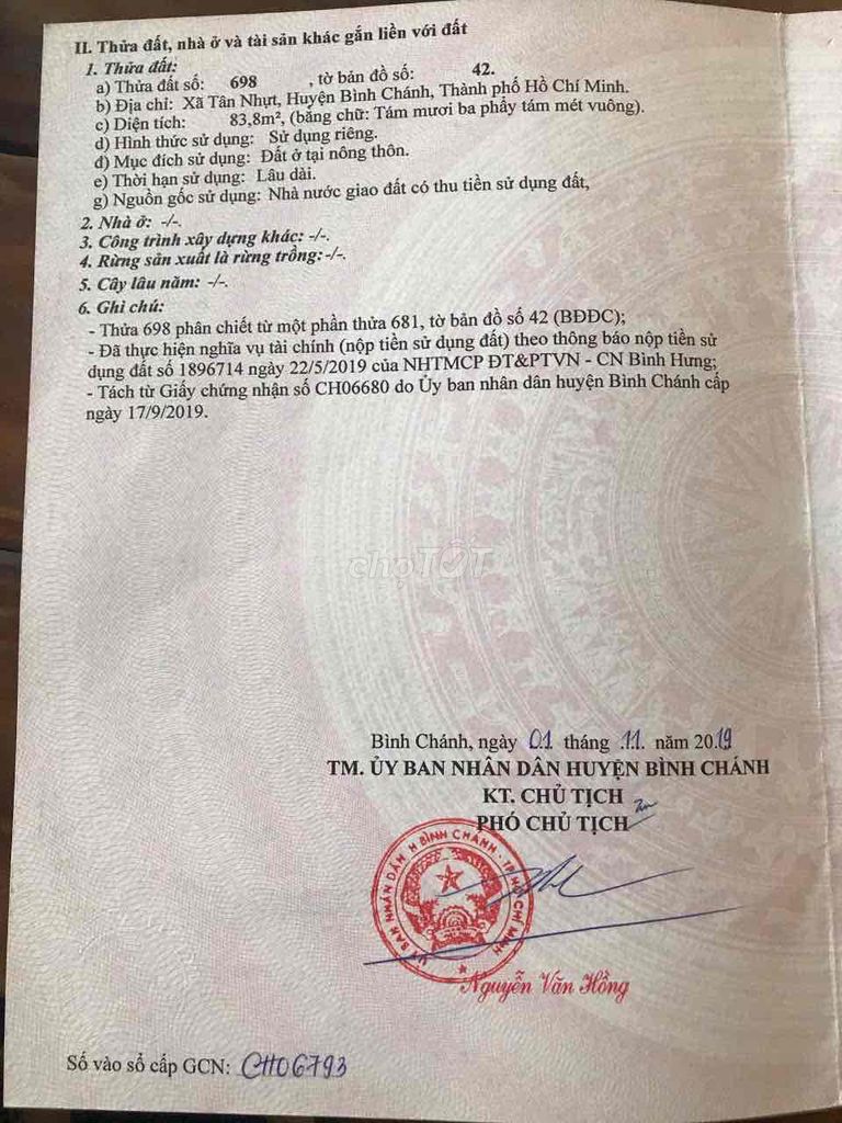 | Trương Văn Đa, Bình Chánh (hẻm xe hơi) | 83 | 25,30 | 2,1 | Đất thổ cư có sổ, nở hậu, thổ cư một phần |