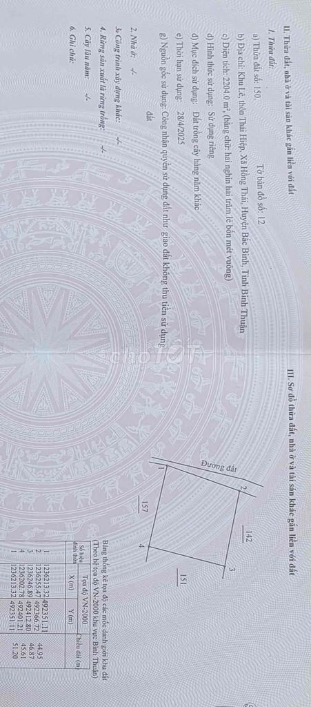 Đất nông nghiệp tại xã Hồng Thái, huyện Bắc Bình, tỉnh Bình Thuận có diện tích 2204 m², với chiều dài 46m và chiều ngang 45m. Giá đăng bán là 320 triệu đồng, tương đương khoảng 145.190 đồng/m². Đất đã có sổ đỏ nhưng không có thổ cư, nên không được phép xây dựng nhà ở hay công trình dân dụng.