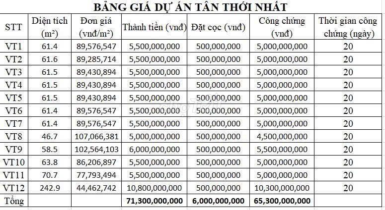 | Địa điểm | Diện tích (m²) | Giá (triệu đồng/m²) | Giá total (tỷ đồng) | Ghi chú |
