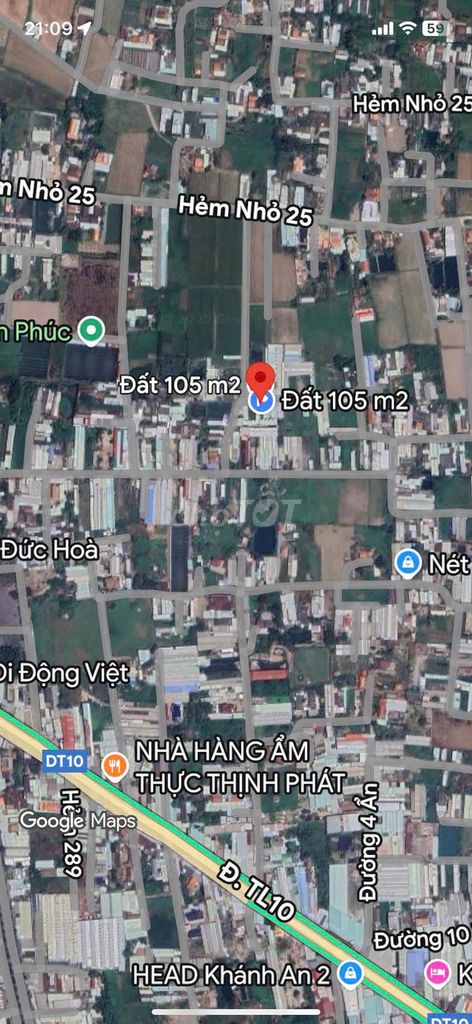 Diện tích lô đất là 105 m² (5×21 m), giá chào bán 1,5 tỷ đồng, tương đương 14,29 triệu đồng/m². Đây là mức giá khá cao so với mặt bằng chung đất thổ cư tại khu vực Đức Hòa Đông, Long An, đặc biệt với đất có mặt tiền chỉ 5 m và nằm trong hẻm xe hơi.
