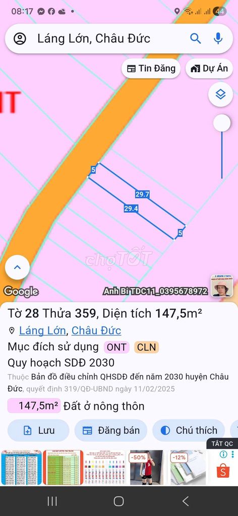 Lô đất có diện tích 140 m² (5x28m) với 80 m² đất thổ cư, mặt tiền đường nhựa tại xã Láng Lớn, huyện Châu Đức, tỉnh Bà Rịa – Vũng Tàu, được chào bán với giá 620 triệu đồng tương đương khoảng 4,43 triệu đồng/m². Vị trí cách trung tâm Phú Mỹ 10km và cách nút giao cao tốc 5km, đồng thời gần tỉnh lộ Mỹ Xuân Ngãi Giao chỉ 500m, rất thuận tiện cho di chuyển.