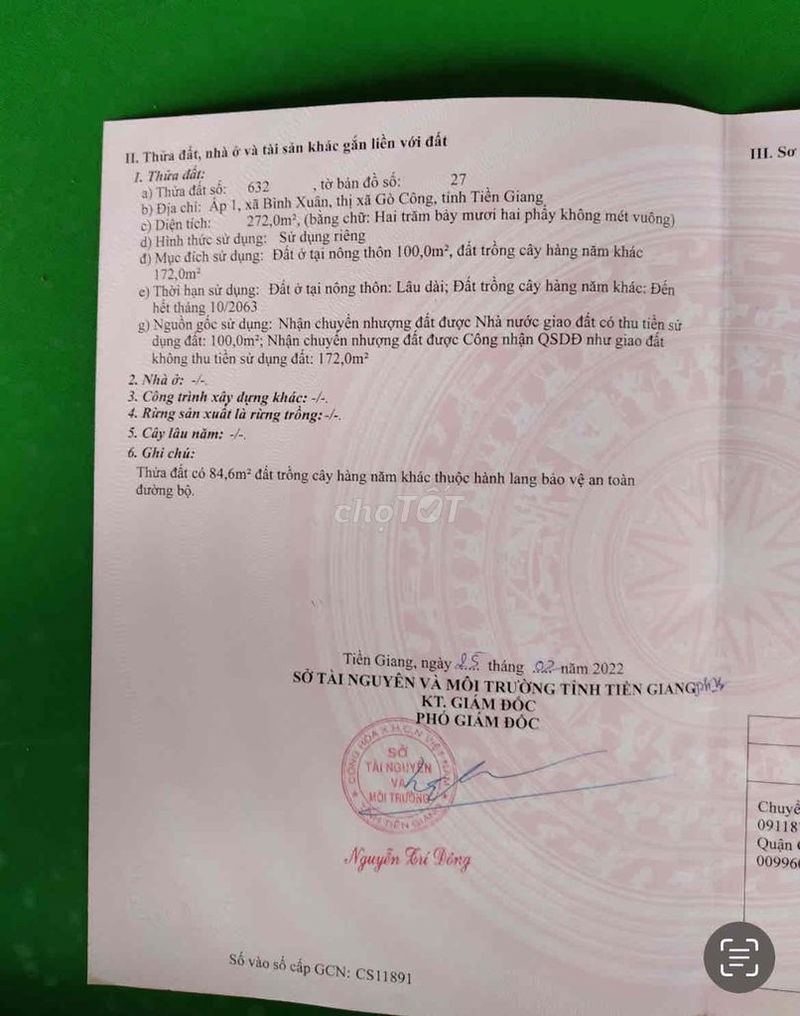 | Xã Bình Xuân, Gò Công | Đất thổ cư, mặt tiền tỉnh lộ | 272 | 5,70 | 1,55 | Đã có sổ, thổ cư 1 phần | 2024 |
