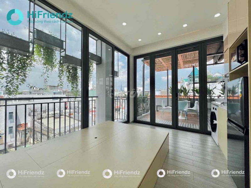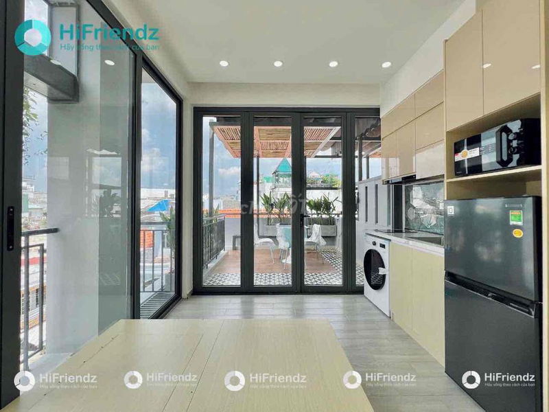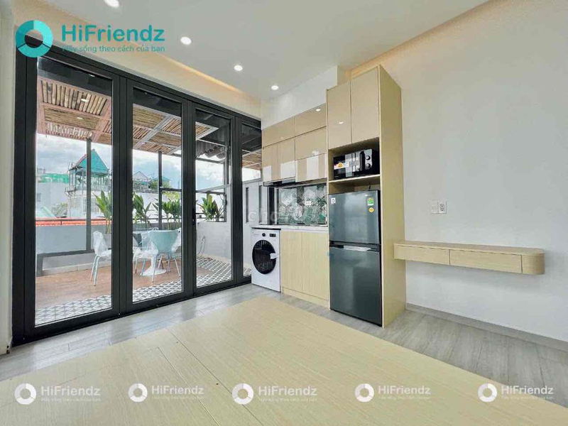 Phòng có diện tích 40 m², ban công, cửa kính lớn giúp phòng sáng, nội thất đầy đủ máy lạnh, bếp riêng, máy giặt, tủ lạnh… rất phù hợp với người đi làm hoặc sinh viên có nhu cầu sống tiện nghi.