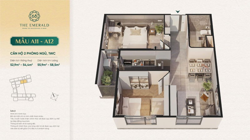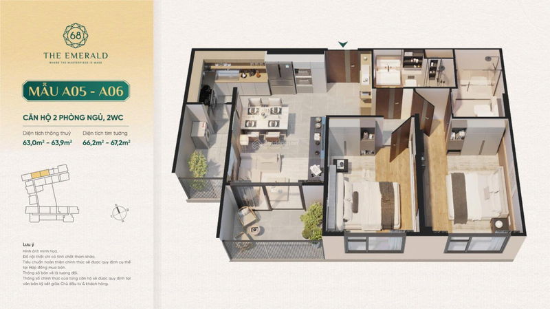 - Căn 2PN: 66m².
