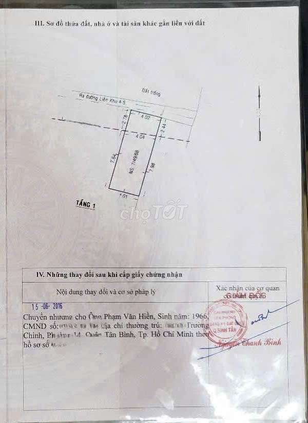 | Phường Bình Hưng Hoà B, Quận Bình Tân | Nhà hẻm xe hơi, 1 tầng | 44 | 2,5 | 56,82 | Nhà có sổ, hẻm xe hơi, 2PN, gần QL1A |