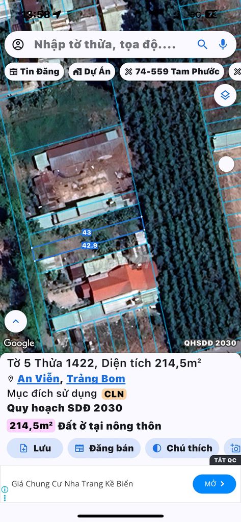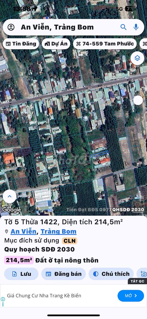 | An Viễn, Trảng Bom, Đồng Nai | Đất nông nghiệp | 214,5 | 5,83 | 1,25 | Hẻm xe hơi, sổ riêng, gần khu công nghiệp Giang Điền |