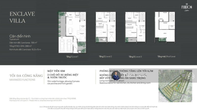 - Thiết kế biệt thự tứ lập với diện tích đất từ 156 m², mặt tiền rộng tối thiểu 10,5 m, tạo không gian sống thoáng đãng và hiện đại.