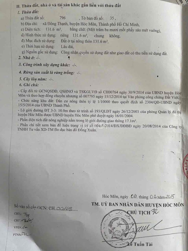 | Đông Thạnh, Hóc Môn (lô đất phân tích) | 131.6 | 7.98 | 1.05 | Thổ cư toàn bộ, mặt tiền đường lớn, sổ hồng riêng | 2024 |